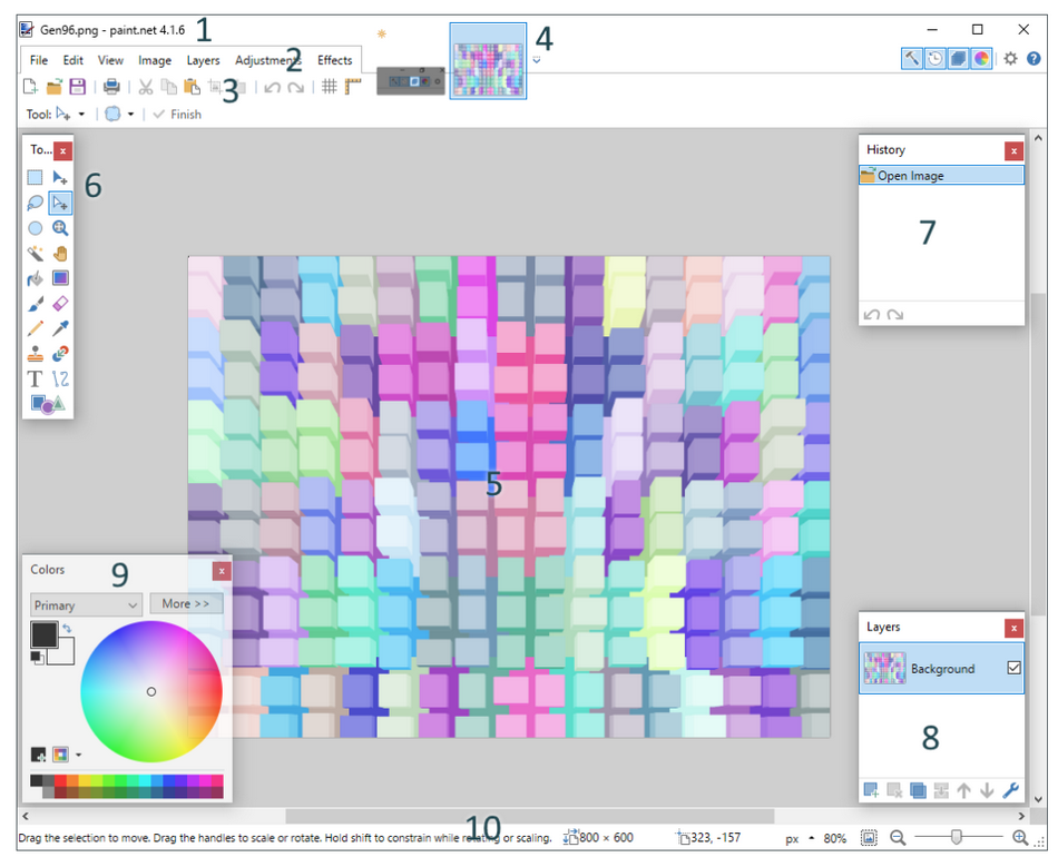 La interfaz de usuario (UI) de paint.net en la siguiente captura de pantalla se ha dividido en diez áreas: